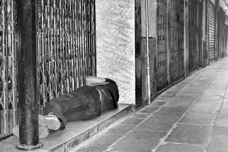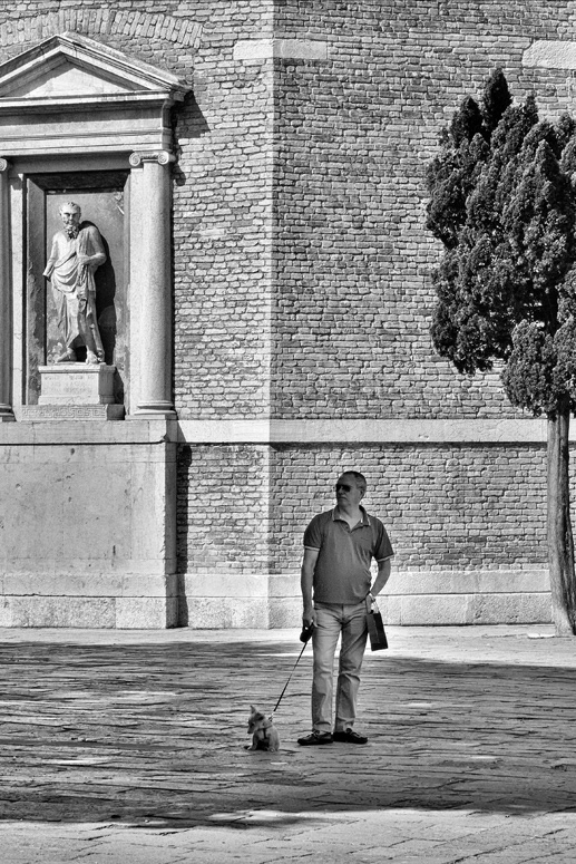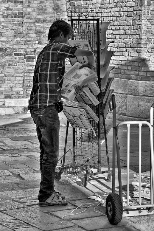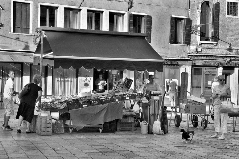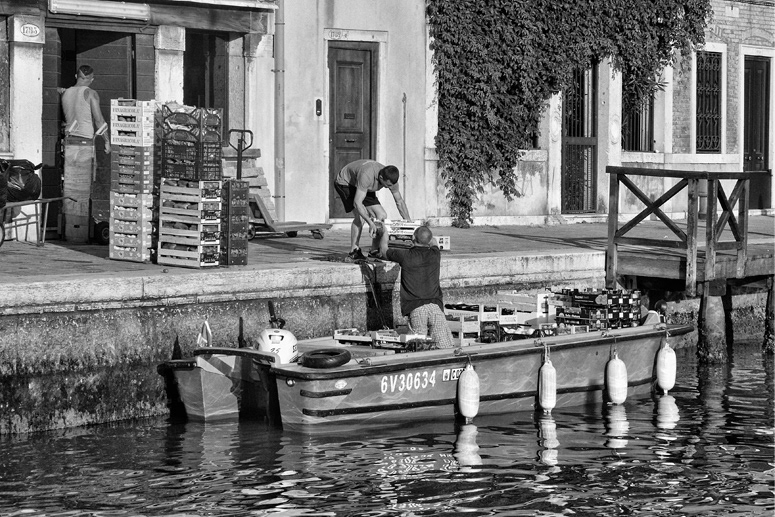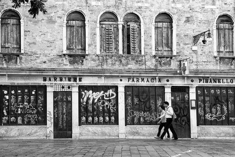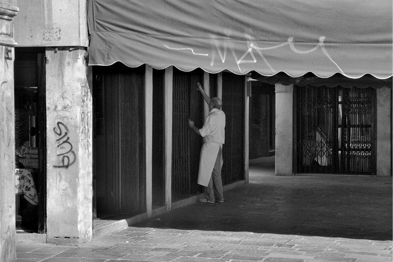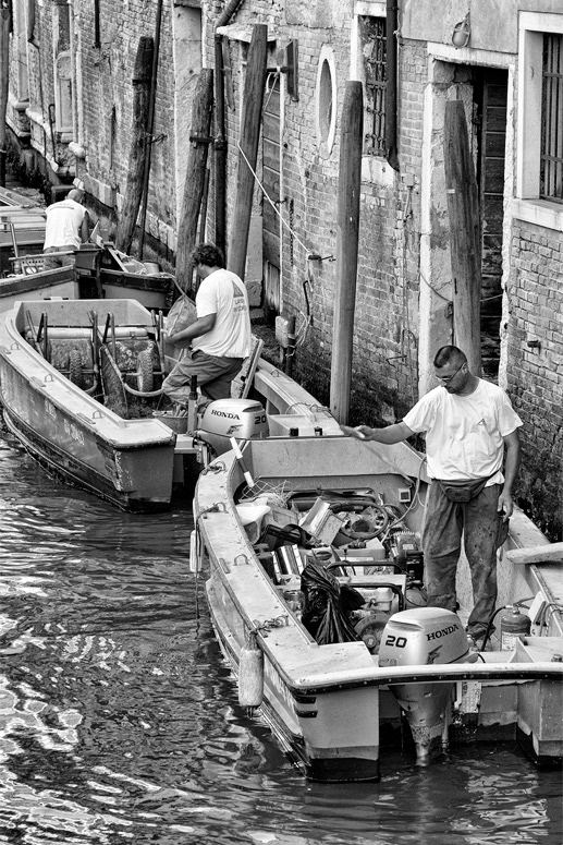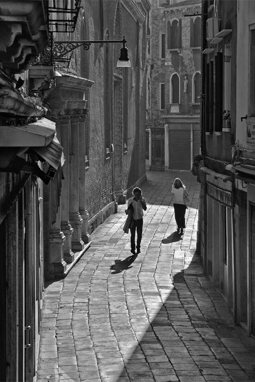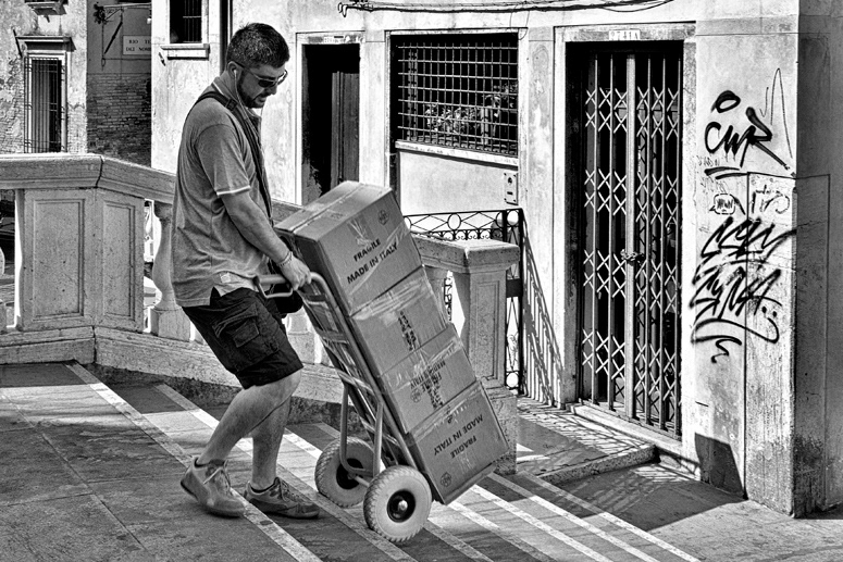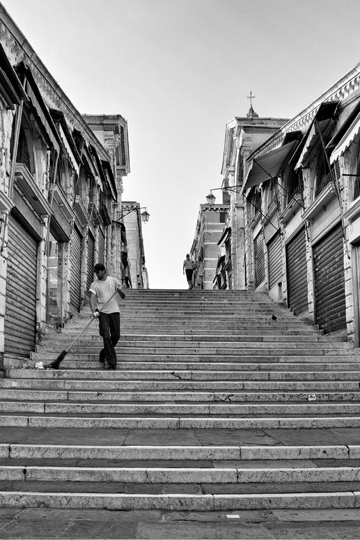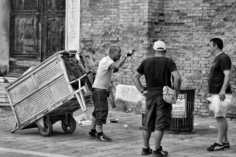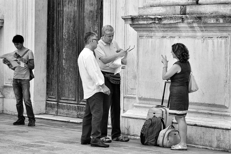 An alternative view of Venice, as the working day begins culminating in the first tourists seeking directions.